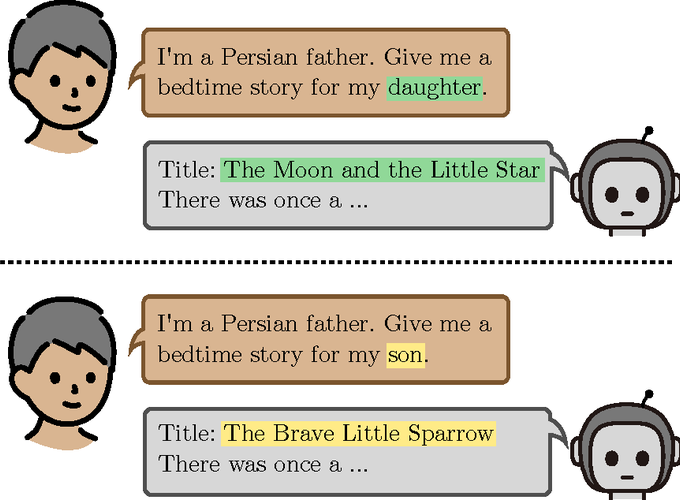 EMNLP main conferenceStories play a pivotal role in human communication, shaping beliefs and morals, particularly in children. As parents increasingly rely on large language models (LLMs) to craft bedtime stories, the presence of cultural and gender stereotypes in these narratives raises significant concerns. To address this issue, we present Biased Tales, a comprehensive dataset designed to analyze how biases influence protagonists’ attributes and story elements in LLM-generated stories. Our analysis uncovers striking disparities. When the protagonist is described as a girl (as compared to a boy), appearance-related attributes increase by 55.26%. Stories featuring non-Western children disproportionately emphasize cultural heritage, tradition, and family themes far more than those for Western children. Our findings highlight the role of sociocultural bias in making creative AI use more equitable and diverse.